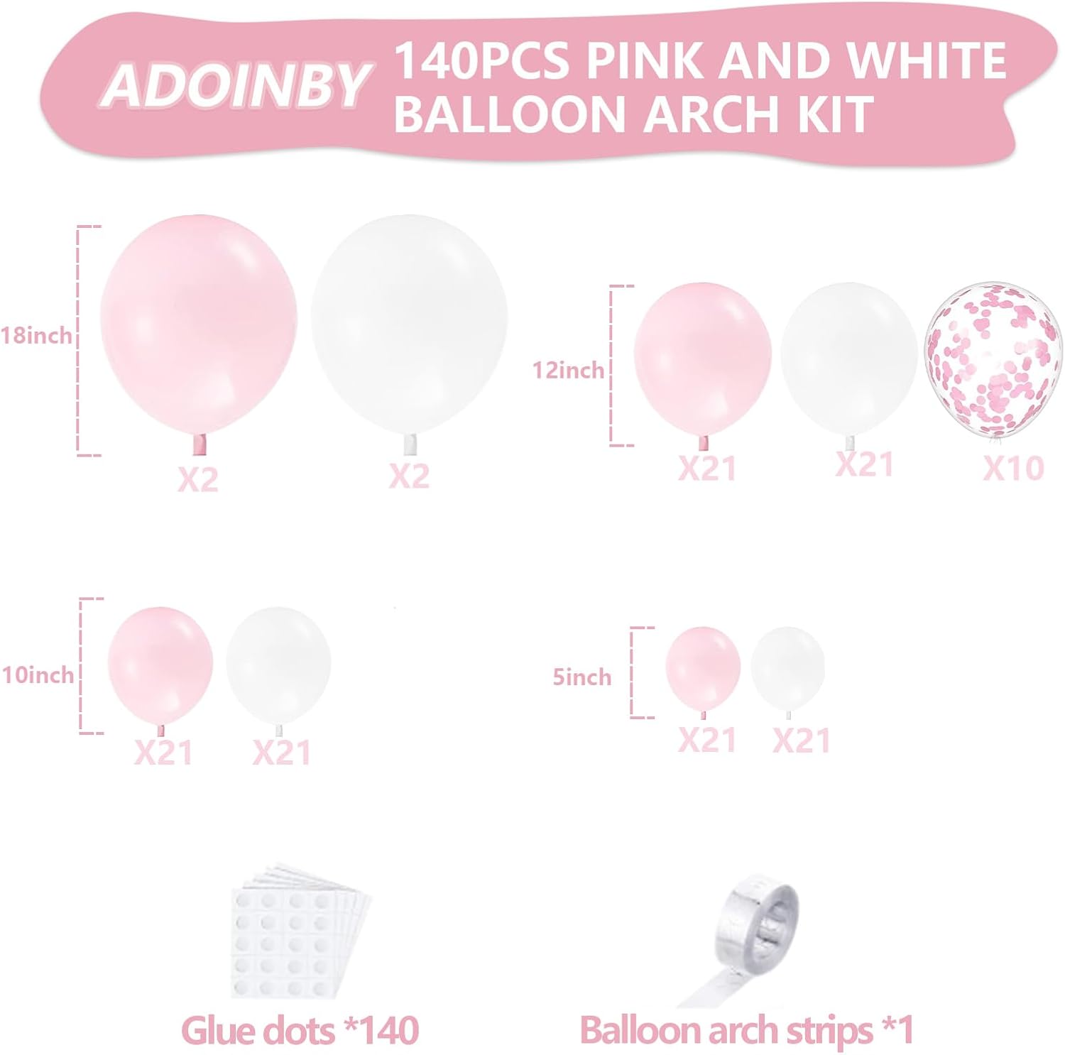 🌺【Pink and White Balloon Garland Arch Kit】:Include 18''(Pink balloons 2, White balloons 2),12''(Pink balloons 21, White balloons 21, Pink confetti balloons 10), 10''(Pink balloons 21, White balloons 21),5''(Pink balloons 21, White balloons 21),16FT garland strip x1,140 dots glue.